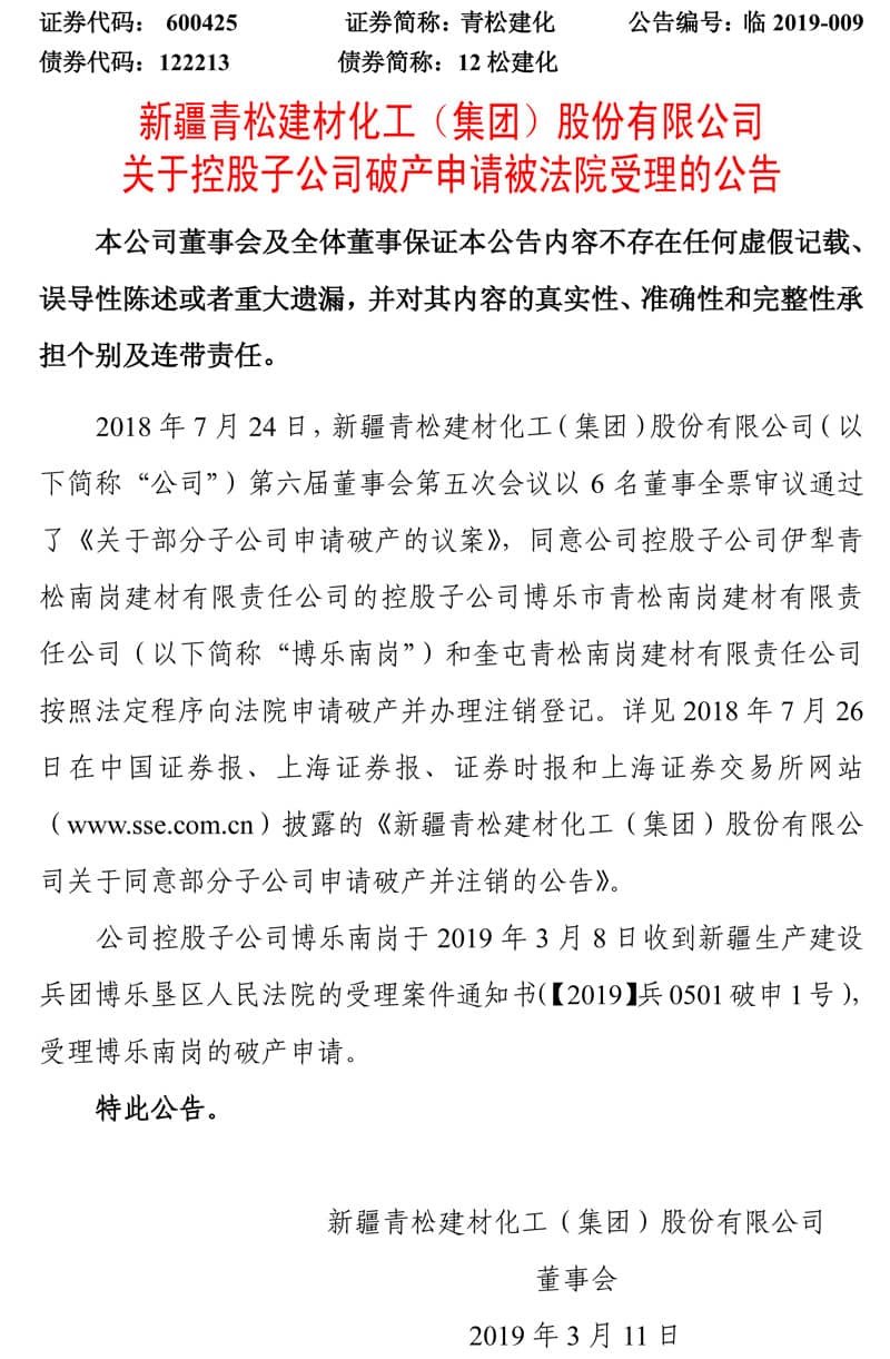 公告稱:2018年7月24日,新疆青松建材化工(集團(tuán))股份有限公司第六屆董事會(huì)第五次會(huì)議以6名董事全票審議通過了《關(guān)于部分子公司申請(qǐng)破產(chǎn)的議案》,同意公司控股子公司伊犁青松南崗建材有限責(zé)任公司的控股子公司博樂市青松南崗建材有限責(zé)任公司和奎屯青松南崗建材有限責(zé)任公司按照法定程序向法院申請(qǐng)破產(chǎn)并辦理注銷登記。