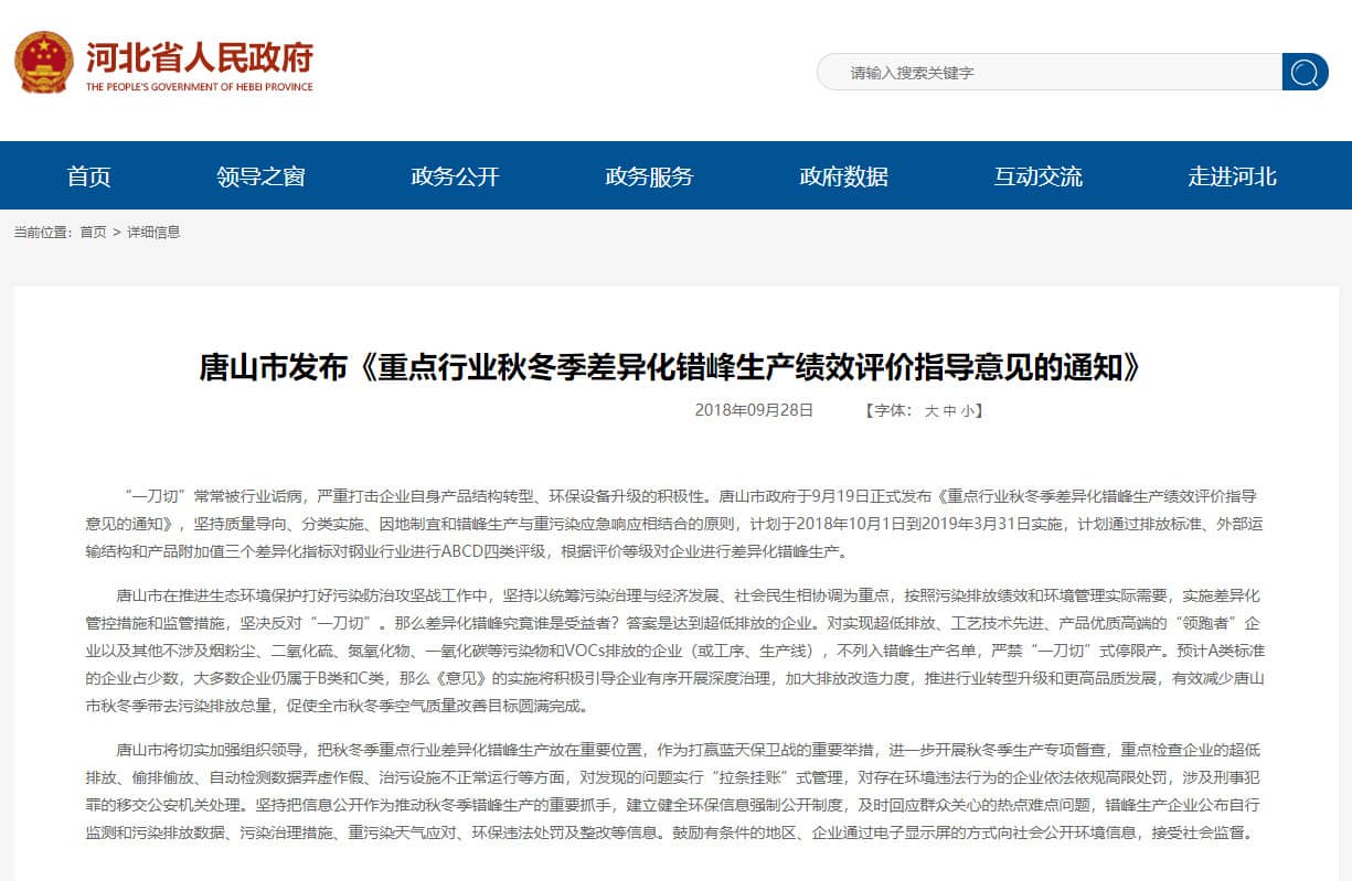 唐山市政府發(fā)布《重點行業(yè)秋冬季差異化錯峰生產(chǎn)績效評價指導(dǎo)意見的通知》,堅持質(zhì)量導(dǎo)向、分類實施、因地制宜和錯峰生產(chǎn)與重污染應(yīng)急響應(yīng)相結(jié)合的原則,計劃于2018年10月1日到2019年3月31日實施,計劃通過排放標準、外部運輸結(jié)構(gòu)和產(chǎn)品附加值三個差異化指標對鋼業(yè)行業(yè)進行ABCD四類評級,根據(jù)評價等級對企業(yè)進行差異化錯峰生產(chǎn)。