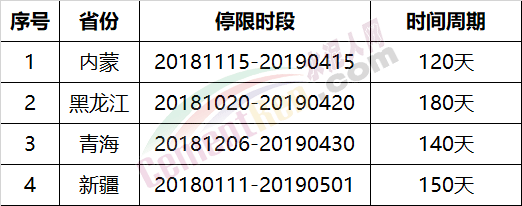 新疆根據(jù)各地冬季采暖期、產(chǎn)能過剩和水泥市場需求情況,疆內(nèi)各地錯峰生產(chǎn)時間有所差異。另外,為實現(xiàn)市場動態(tài)平衡,保證市場供應(yīng),全疆各區(qū)域在去年錯峰停窯的基礎(chǔ)上再增加一至半個月錯峰停窯時間,也是就說,錯峰停窯分兩個時間段執(zhí)行。根據(jù)新疆維吾爾自治區(qū)經(jīng)信委以及環(huán)保廳聯(lián)合下發(fā)的《關(guān)于2018-2019年冬季水泥錯峰生產(chǎn)的通知》要求,具體錯峰停窯時間為:和田2018年12月1日至2019年3月1日、2019年4月1日至2019年5月1日共計4個月;喀什、克州2018年11月1日至2019年3月1日、2019年4月1日至2019年5月1日共計5個月;阿克蘇、巴州2018年11月1日至2019年4月1日、2019年5月1日至6月1日共計6個月;其他地州市2018年11月1日至2019年5月1日、2019年6月1日至2019年7月1日,共計7個月。