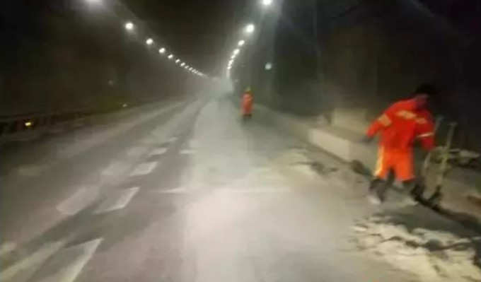 因?yàn)樗嗍欠蹓m類物質(zhì),加上隧道空間狹窄,極不好清理。繞城高速西南段分公司立即組織養(yǎng)護(hù)人員20余人進(jìn)行人工作業(yè),清掃作業(yè)車、灑水車、水炮降塵車等九個(gè)來回進(jìn)行沖洗、降塵;