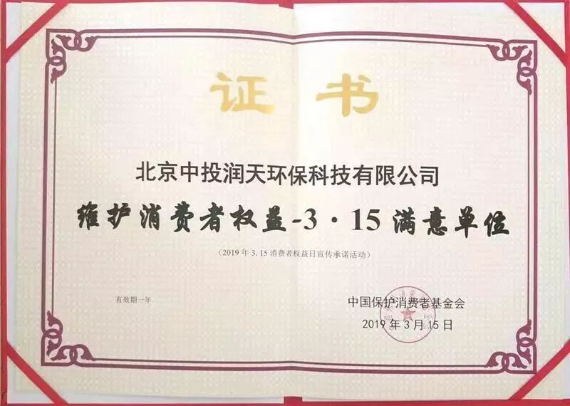 北京中投潤天環(huán)保榮獲3.15維護消費者權(quán)益滿意單位