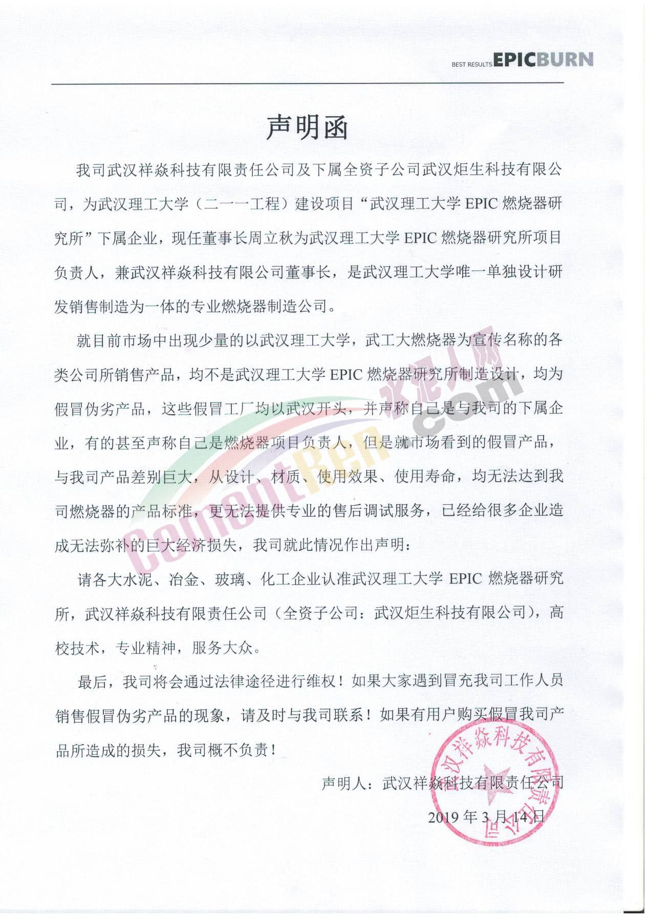 據(jù)武漢祥焱科技相關負責人介紹,目前市場上出現(xiàn)少量的以武漢理工大學,武工大燃燒器為宣傳名稱的各類公司所銷售產(chǎn)品。這些產(chǎn)品均不是武漢理工大學EPIC燃燒器研究所制造設計,均為假冒偽劣產(chǎn)品。