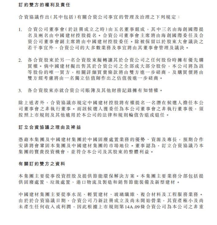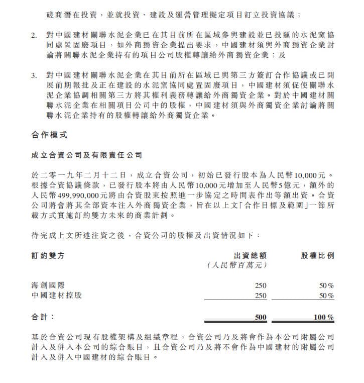公告聲明,合資公司不僅將獨占中建材待開發(fā)的水泥窯資源,同時有權(quán)力獲得中建材已建項目的股權(quán),而對于與第三方合作的協(xié)同處置項目,合資公司也有權(quán)力繼承中建材股權(quán)并由中建材督促第三方將其股權(quán)轉(zhuǎn)讓給合資公司,由此未來合資公司將獨占中建材相關(guān)的的協(xié)同處置項目和待開發(fā)水泥窯資源?,F(xiàn)有及未來的固廢處置業(yè)務總產(chǎn)能將不少于300萬噸╱年。