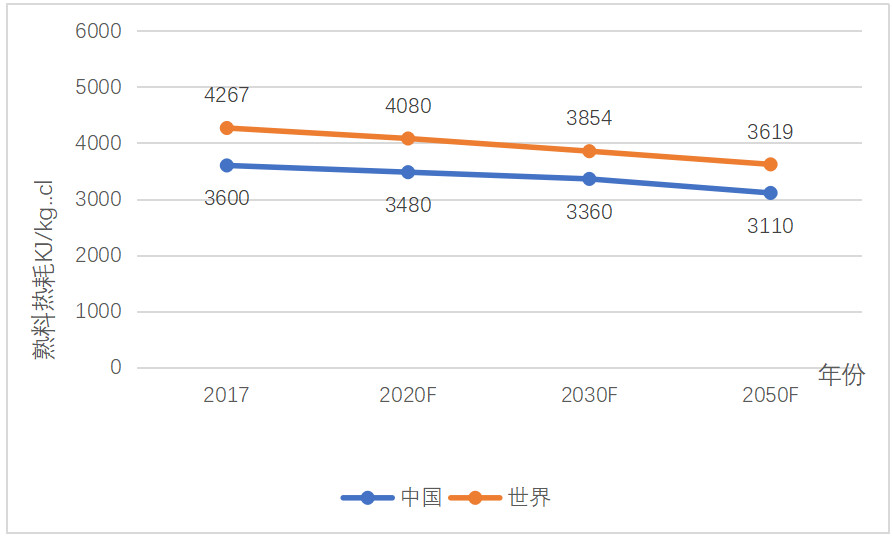 kJ/kg,2050年比2017年降低15.2%; 中國則分別為3360 kJ/kg和3110 kJ/kg,,相應(yīng)地降低13.6%。同樣2050年,中國的熟料單位熱耗比世界均值先進不少,低13.9%,主要是熟料燒成技術(shù)裝備已處于領(lǐng)先水平。