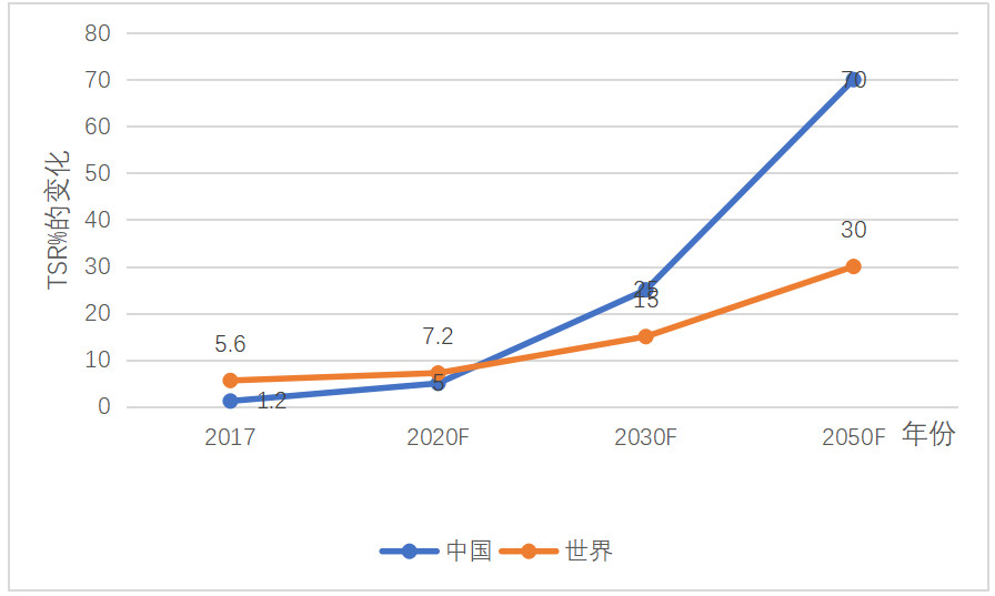 2030年和2050年,世界TSR分別為15% 和30%,2050年比2017年增加24.4個百分點; 中國的TSR分別為25% 和70%, 2050年比2017年增加68.8個百分點。TSR比世界均值先進得多。