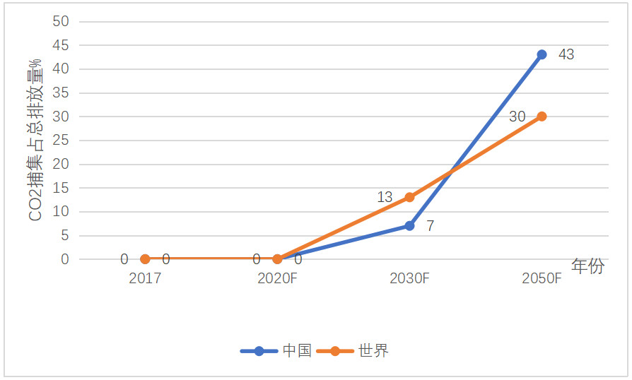 2030年和2050年,世界水泥工業(yè)二氧化碳捕集量占總排放量的比例,分別為13%和30%,中國分別為7%和43%。同樣,中國比世界均值先進得多。