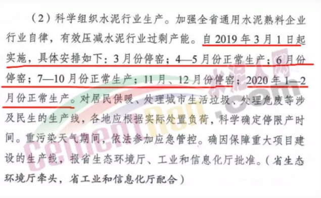 文件要求水泥行業(yè)科學(xué)組織生產(chǎn),加強(qiáng)水泥熟料企業(yè)自律,有效壓減水泥行業(yè)過剩產(chǎn)能。自3月1日起停窯限產(chǎn),4、5月正常生產(chǎn),6月停限,7-10月正常生產(chǎn),11、12月停窯。共計(jì)停限4個(gè)月,加上2019年1、2月份的停窯限產(chǎn),河南省2019年也要停限產(chǎn)6個(gè)月(180天)以上。