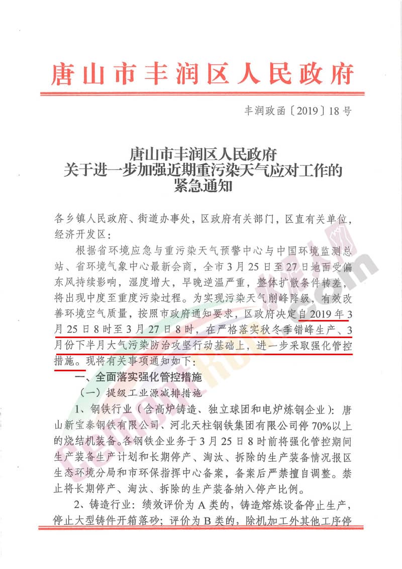 河北省唐山市,這個(gè)京津冀地區(qū)的“水泥窩”,一遇到重污染天氣就發(fā)布緊急通知。昨日(3月25日),唐山市豐潤區(qū)人民政府發(fā)布豐潤政函【2019】18號(hào)文件《關(guān)于進(jìn)一步加強(qiáng)近期重污染天氣應(yīng)對(duì)工作的緊急通知》要求自3月25日至3月27日,在嚴(yán)格落實(shí)秋冬季錯(cuò)峰生產(chǎn),3月份下半月大氣污染攻堅(jiān)行動(dòng)基礎(chǔ)上,進(jìn)一步采取強(qiáng)化管控措施。