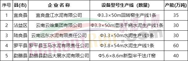 云南省2018年重點工業(yè)行業(yè)淘汰落后和壓減過剩產能完成情況公示名單中包含五家水泥企業(yè),淘汰產能共計195萬噸。淘汰產能詳情如下: