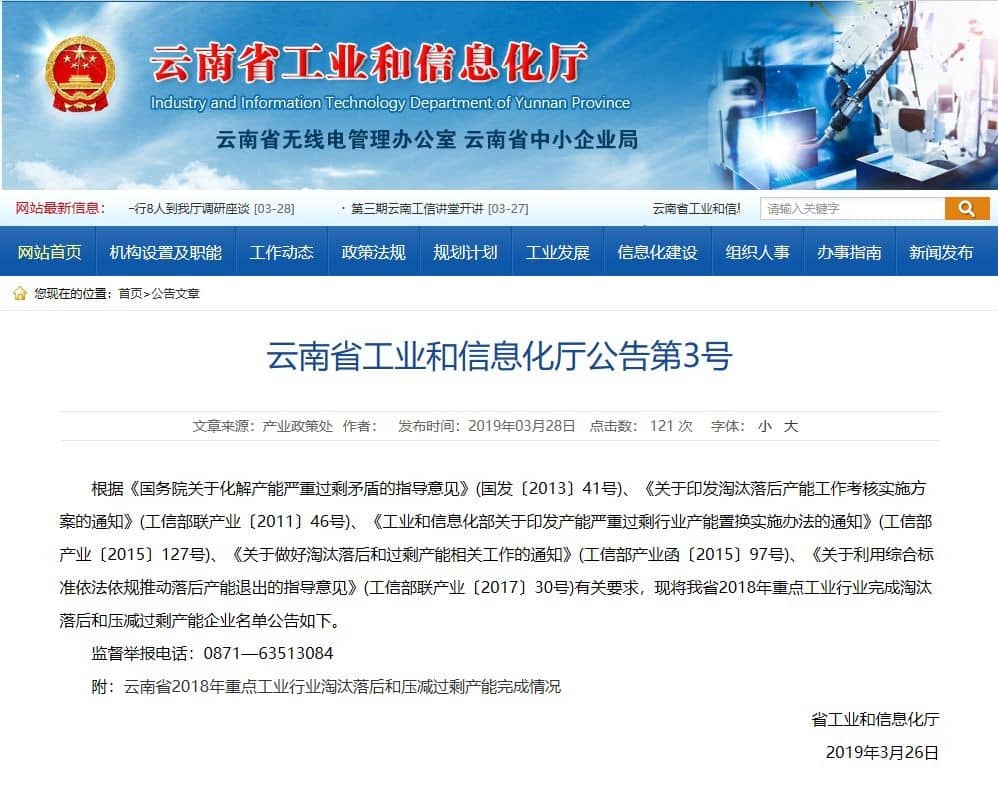 日前,云南省工信廳發(fā)布2019年第3號公告,公告稱根據《國務院關于化解產能嚴重過剩矛盾的指導意見》(國發(fā)〔2013〕41號)、《關于印發(fā)淘汰落后產能工作考核實施方案的通知》(工信部聯(lián)產業(yè)〔2011〕46號)、《工業(yè)和信息化部關于印發(fā)產能嚴重過剩行業(yè)產能置換實施辦法的通知》(工信部產業(yè)〔2015〕127號)、《關于做好淘汰落后和過剩產能相關工作的通知》(工信部產業(yè)函〔2015〕97號)、《關于利用綜合標準依法依規(guī)推動落后產能退出的指導意見》(工信部聯(lián)產業(yè)〔2017〕30號)有關要求,現(xiàn)將云南省2018年重點工業(yè)行業(yè)完成淘汰落后和壓減過剩產能企業(yè)名單予以公告,監(jiān)督舉報電話:0871—63513084。