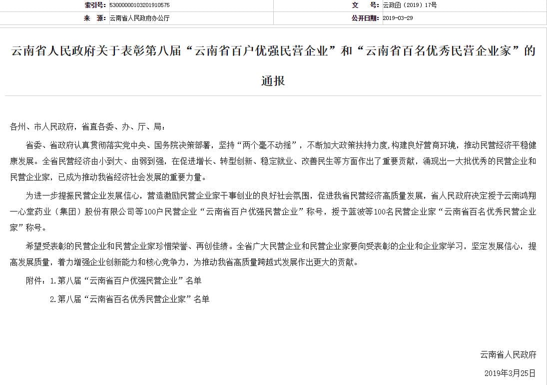 日前云南省人民政府發(fā)布《關(guān)于表彰第八屆“云南省百戶優(yōu)強民營企業(yè)”和“云南省百名優(yōu)秀民營企業(yè)家”的通報》稱為進一步提振民營企業(yè)發(fā)展信心,營造激勵民營企業(yè)家干事創(chuàng)業(yè)的良好社會氛圍,促進云南省民營經(jīng)濟高質(zhì)量發(fā)展,省人民政府決定授予云南鴻翔一心堂藥業(yè)(集團)股份有限公司等100戶民營企業(yè)“云南省百戶優(yōu)強民營企業(yè)”稱號,授予藍波等100名民營企業(yè)家“云南省百名優(yōu)秀民營企業(yè)家”稱號。