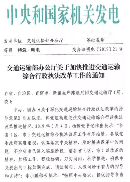 近日,交通運輸部辦公廳下發(fā)特急明電,要求加快推進交通運輸綜合行政執(zhí)法改革工作。
