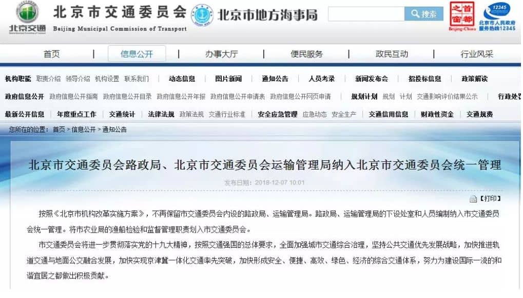 北京市交通委員會去年12月7日便下發(fā)了《北京市機構(gòu)改革實施方案》,不再保留北京市交通委員會內(nèi)設(shè)的路政局、運輸管理局。