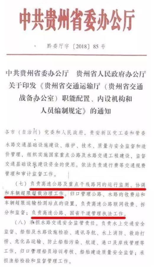 貴州省印發(fā)交通運輸廳三定方案,指出負責(zé)高速公路及重點干線路網(wǎng)的運行監(jiān)測、協(xié)調(diào)和車輛超限超載治理工作。歸口管理公路、水路的收費站和車輛超限運輸檢測站點的設(shè)置,負責(zé)高速公路聯(lián)網(wǎng)收費、拆分和監(jiān)督;負責(zé)高速公路、國省干道管理執(zhí)法工作。由此可以理解為:貴州的高速公路、國省道管理執(zhí)法工作,由省垂直管理?