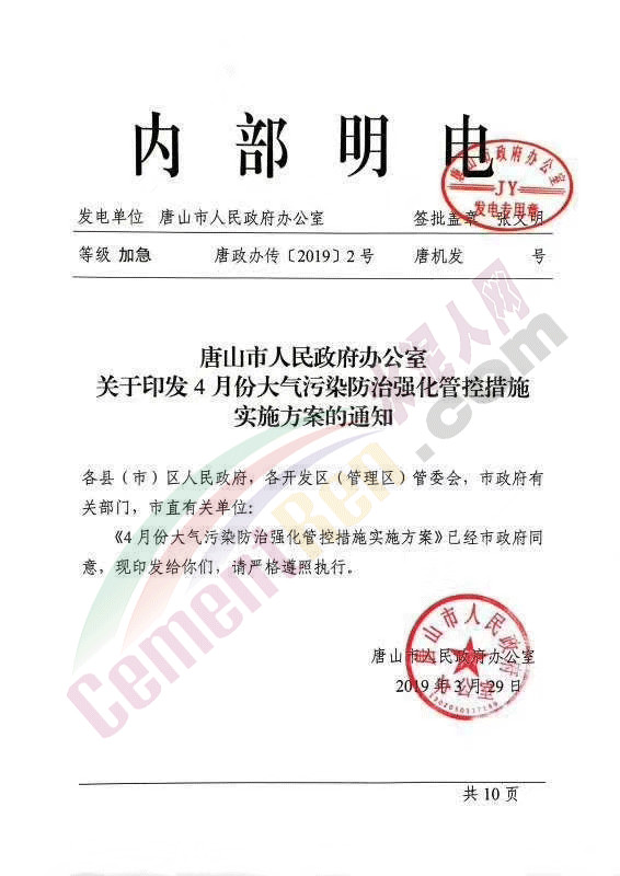 水泥人網(wǎng)最新消息:日前,唐山市人民政府辦公室發(fā)布內(nèi)部明電唐政辦傳【2019】2號(hào)《關(guān)于印發(fā)4月份大氣污染防治強(qiáng)化管控措施實(shí)施方案的通知》稱,《4月份大氣污染防治強(qiáng)化管控措施實(shí)施方案》已經(jīng)市政府同意。