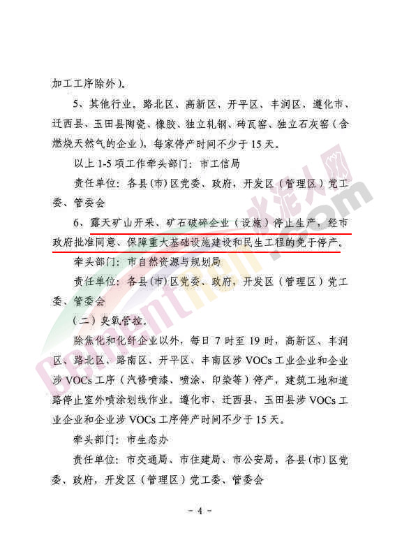 ⑸高新區(qū)、豐潤(rùn)區(qū)、遵化市、遷西縣、玉田縣粉磨站,每家企業(yè)停產(chǎn)時(shí)間不少于15天。