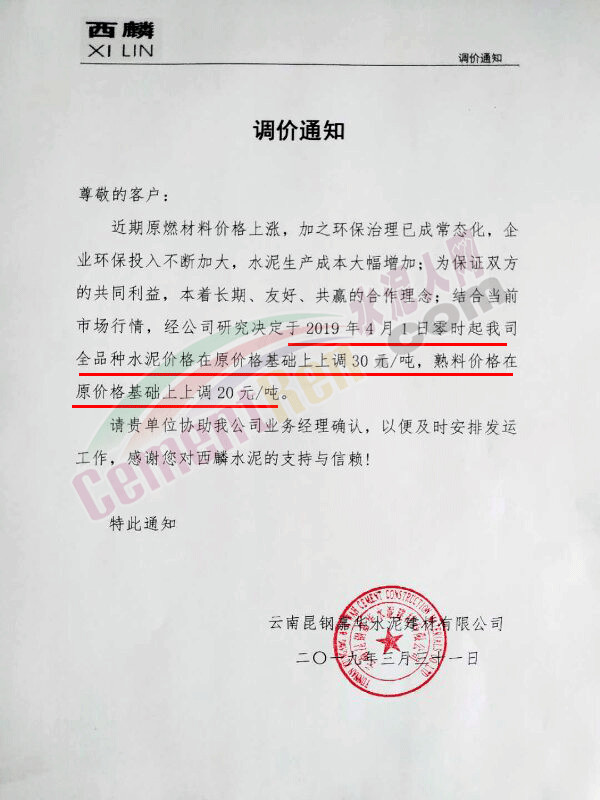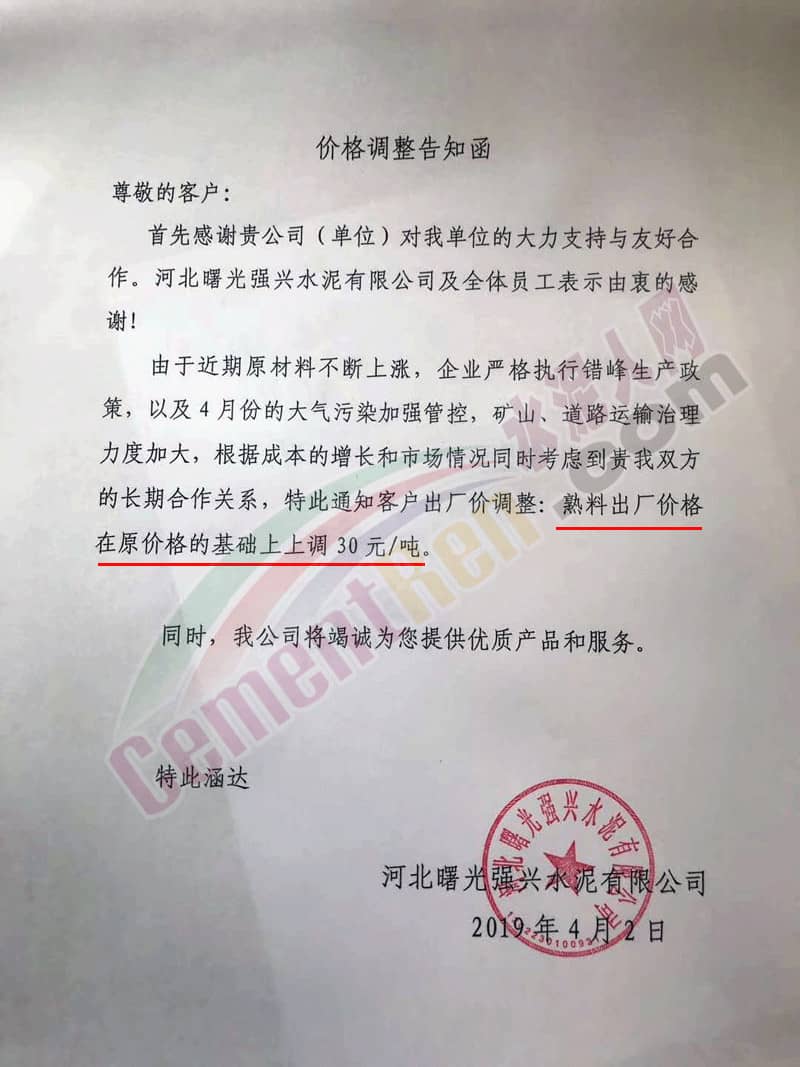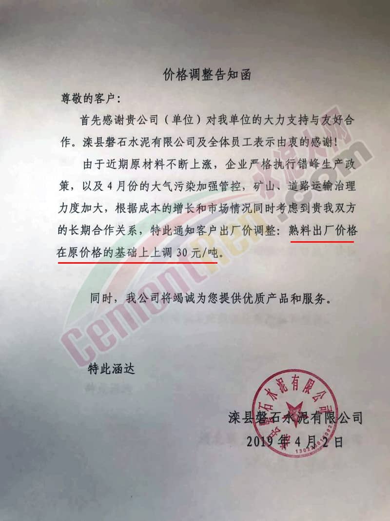 唐山金馬啟新水泥有限公司價(jià)格調(diào)整告知函稱,因近期采取提高汽車排放標(biāo)準(zhǔn),加大貨運(yùn)車輛治理力度,對(duì)環(huán)保及相關(guān)企業(yè)不斷實(shí)行錯(cuò)峰生產(chǎn),限產(chǎn),停產(chǎn)等措施。隨著國(guó)家環(huán)保壓力不斷加大,水泥生產(chǎn)成本和運(yùn)輸成本不斷上升及水泥行情變化,金馬啟新水泥的價(jià)格進(jìn)行調(diào)整,具體調(diào)整如下:自2019年4月1日早0時(shí)起,所有水泥價(jià)格上調(diào)40元/噸。