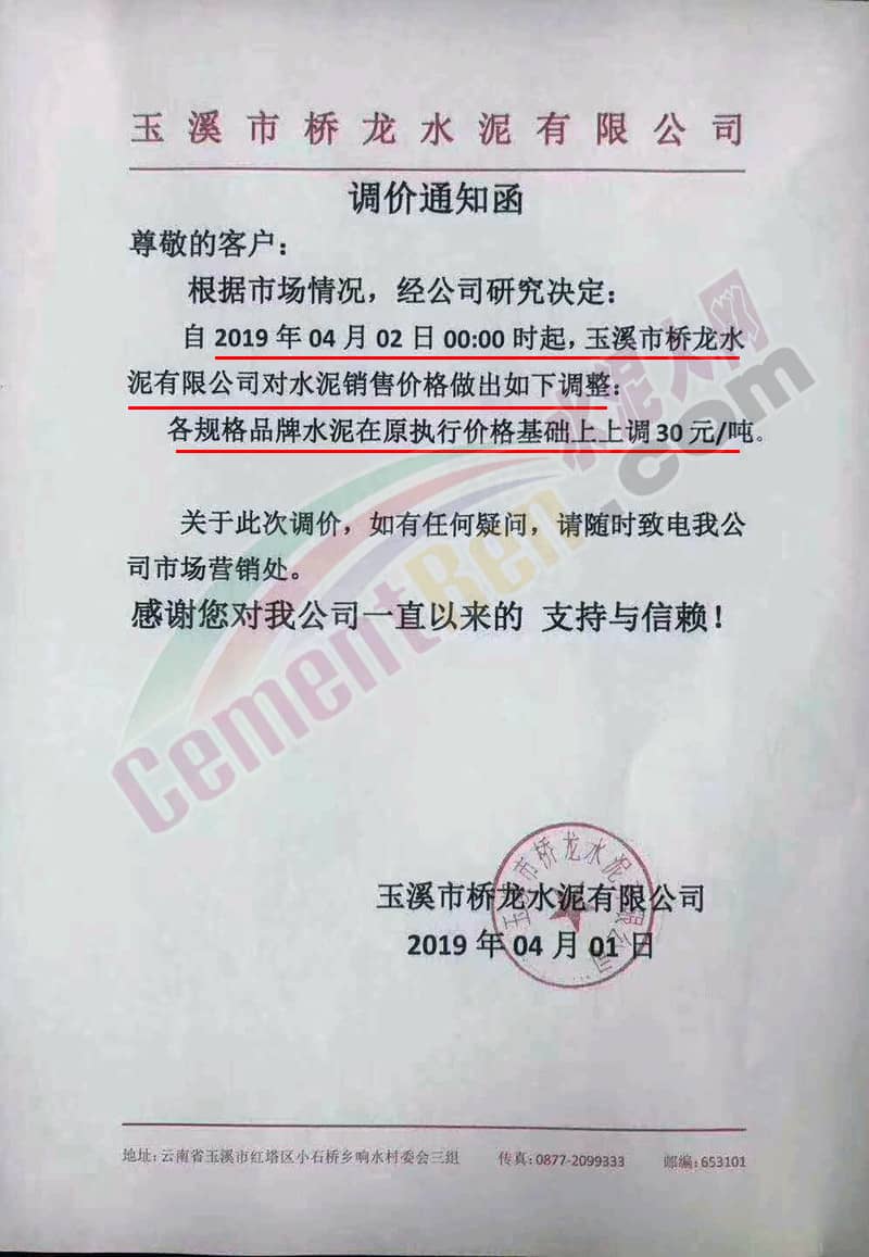 玉溪市橋龍水泥有限公司調(diào)價(jià)通知稱,自4月2日起各規(guī)格品牌水泥在原執(zhí)行價(jià)格基礎(chǔ)上上調(diào)30元/噸。