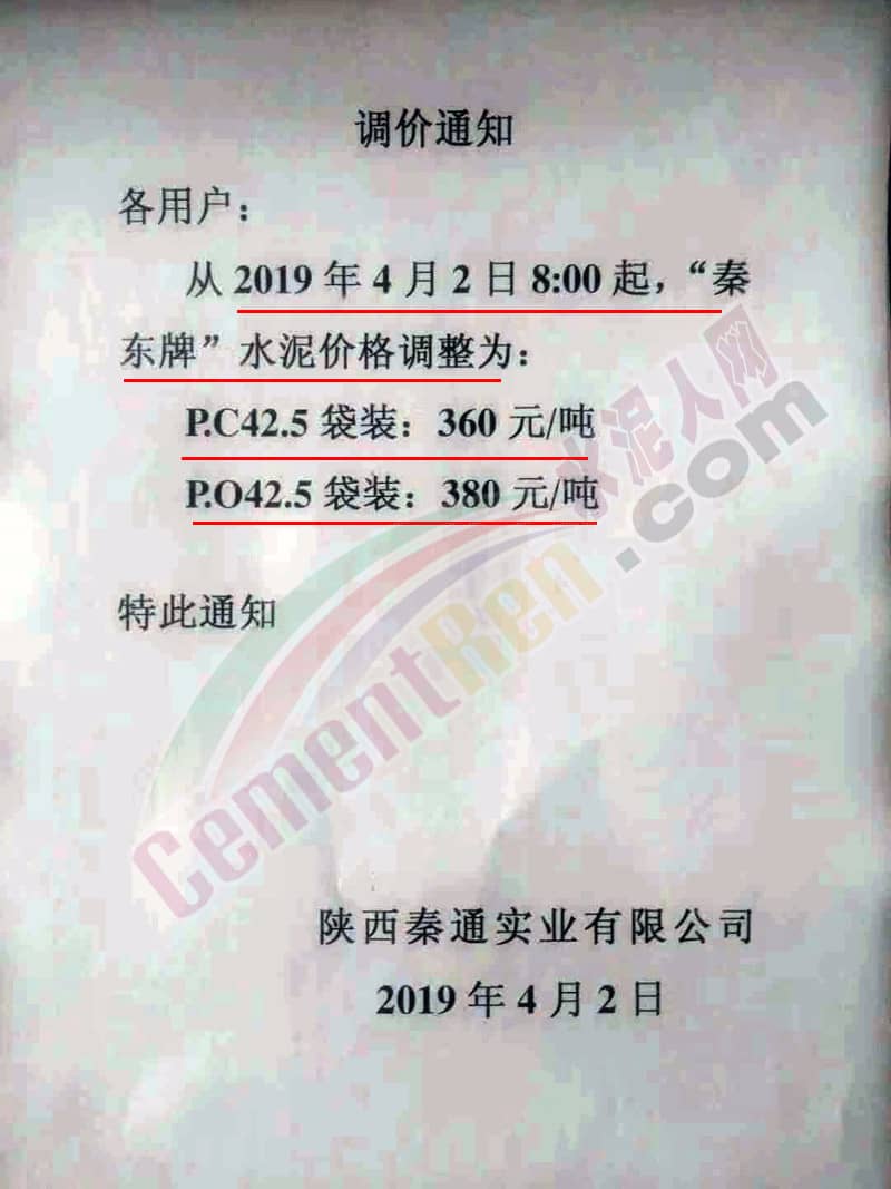 陜西秦通實(shí)業(yè)有限公司調(diào)價(jià)通知稱自4月2日起“秦東牌”水泥價(jià)格調(diào)整為P.C42.5袋裝:360元/噸,P.O42.5袋裝:380元/噸。