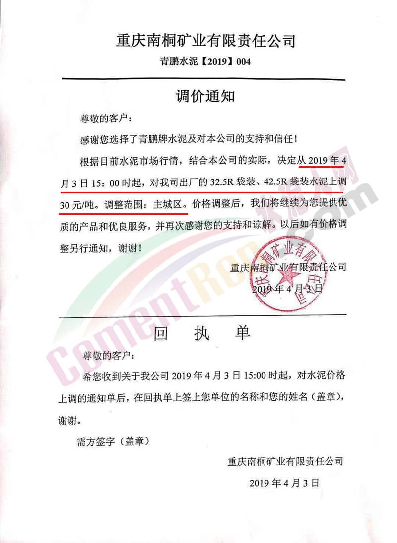 同期,重慶區(qū)域主導(dǎo)企業(yè)亦通知上調(diào)水泥價(jià)格,重慶金隅冀東水泥貿(mào)易有限公司調(diào)價(jià)函稱,根據(jù)目前市場(chǎng)變化情況 ,經(jīng)公司研究決定 ,對(duì)重慶主城區(qū)從冀東水泥璧山有限公司、冀東水泥重慶合川有限責(zé)任公司出廠的所有袋裝水泥(不包含“壹號(hào)工匠”家裝水泥)價(jià)格上調(diào)20元/噸,執(zhí)行時(shí)間4月3日8點(diǎn)。