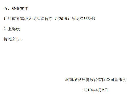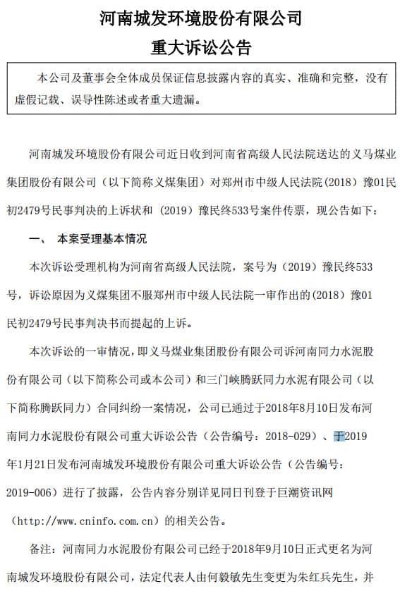 4月3日,河南城發(fā)環(huán)境股份有限公司(000885.SZ)發(fā)布(以下簡(jiǎn)稱(chēng)城發(fā)環(huán)境)《重大訴訟公告》(以下簡(jiǎn)稱(chēng)“公告”)。城發(fā)環(huán)境近日收到河南省高級(jí)人民法院送達(dá)的義馬煤業(yè)集團(tuán)股份有限公司(以下簡(jiǎn)稱(chēng)義煤集團(tuán))對(duì)鄭州市中級(jí)人民法院(2018)豫01民初2479號(hào)民事判決的上訴狀和 (2019)豫民終533號(hào)案件傳票。