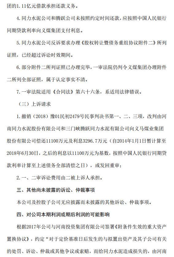 2018年7月,義煤集團(tuán)訴河南同力水泥股份有限公司和三門(mén)峽騰躍同力水泥有限公司合同糾紛一案由河南省鄭州市中級(jí)人民法院立案受理。鄭州中級(jí)人民法院判決河南同力水泥股份有限公司在三方配合完成本判決第一項(xiàng)所列證照辦理完畢后30日內(nèi),向三門(mén)峽騰躍同力水泥有限公司提供1.11億元資金,由三門(mén)峽騰躍同力水泥有限公司用于償還其對(duì)義煤集團(tuán)的債務(wù)。同時(shí)鄭州中級(jí)人民法院判決案件受理費(fèi)由義馬煤業(yè)集團(tuán)股份有限公司負(fù)擔(dān)和河南同力水泥股份有限公司共同負(fù)擔(dān)。公告原文如下: