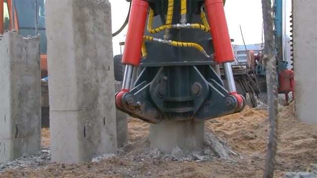 機(jī)器作業(yè)的時(shí)候,工人們需要將這個(gè)設(shè)備的氣缸和水泥柱對(duì)準(zhǔn),當(dāng)設(shè)備不斷下降的時(shí)候,氣缸就會(huì)包裹住水泥柱,接著切樁機(jī)上配有的液壓裝置就會(huì)作為一個(gè)驅(qū)動(dòng),位于切樁機(jī)底部的鉗口就會(huì)壓把頭壓裂。