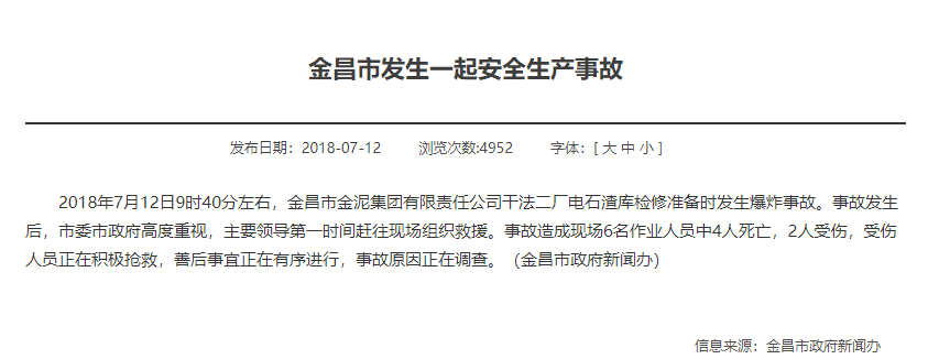 2018年7月12日9時40分左右,金昌水泥(集團)有限責(zé)任公司新型干法水泥二廠電石渣庫發(fā)生一起爆炸事故,造成現(xiàn)場4人死亡、2人受傷,直接經(jīng)濟損失494萬元。后經(jīng)調(diào)查認定金泥集團公司干法二廠“7.12”爆炸事故是由于違章指揮、違章作業(yè)導(dǎo)致的一起較大生產(chǎn)安全責(zé)任事故。