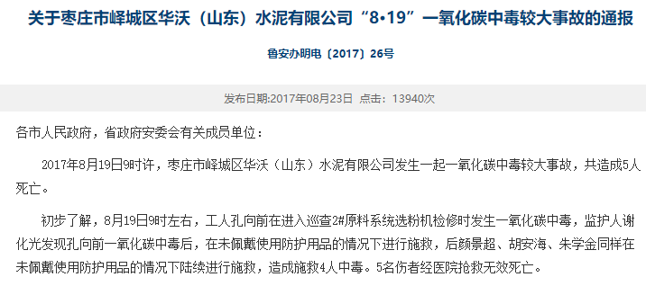 也是在山東省,2017年8月19日9時許,位于棗莊市嶧城區(qū)的華沃(山東)水泥有限公司原料車間在檢修過程中發(fā)生一起一氧化碳較大中毒事故,造成1人中毒,4人因施救不當(dāng)中毒,5人經(jīng)搶救無效死亡,直接經(jīng)濟損失約699萬元。經(jīng)調(diào)查認定,這是一起較大生產(chǎn)安全責(zé)任事故。