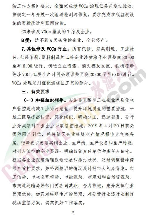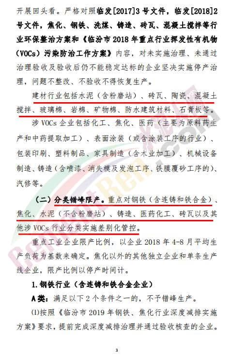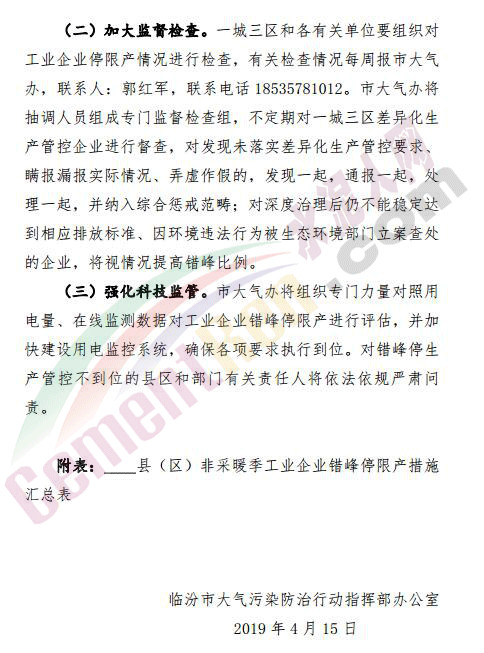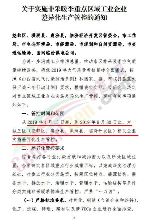 日前,山西臨汾市下達(dá)非采暖季重點區(qū)域差異化生產(chǎn)管控的通知,從2019年4月15日起,到2019年9月30日止,對一城三區(qū)(堯都區(qū)、襄汾縣、洪洞縣,臨汾開發(fā)區(qū))相關(guān)企業(yè)實施差異化生產(chǎn)管控。嚴(yán)格對照臨發(fā)[2017]3號文件, 臨發(fā)[2018]2號文件,焦化、鋼鐵、洗煤、鑄造、磚瓦、混凝土攪拌等行業(yè)環(huán)保整治方案和《臨汾市2018年重點行業(yè)揮發(fā)性有機物(VOCs)污染防治工作方案》。重點對鋼鐵(含連鑄和鐵合金)、焦化、水泥(不含粉磨站)、鑄造其他涉VOCs行業(yè)分類實施差別化管控。