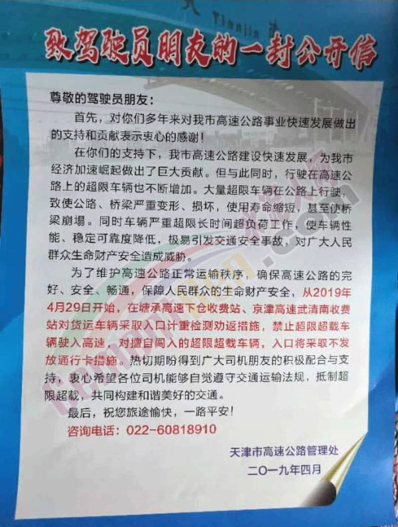 不僅唐山地區(qū)在重點(diǎn)整治超限。日前,天津市高速公路管理處發(fā)布了《致駕駛員朋友的一封公開(kāi)信》稱自4月29開(kāi)始,在高速收費(fèi)站采取入口計(jì)量檢測(cè)勸返措施,禁止超限超載車輛駛?cè)敫咚佟?/span>
