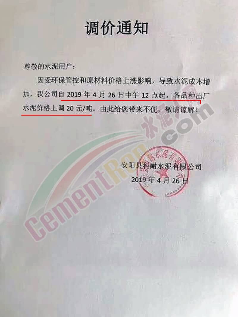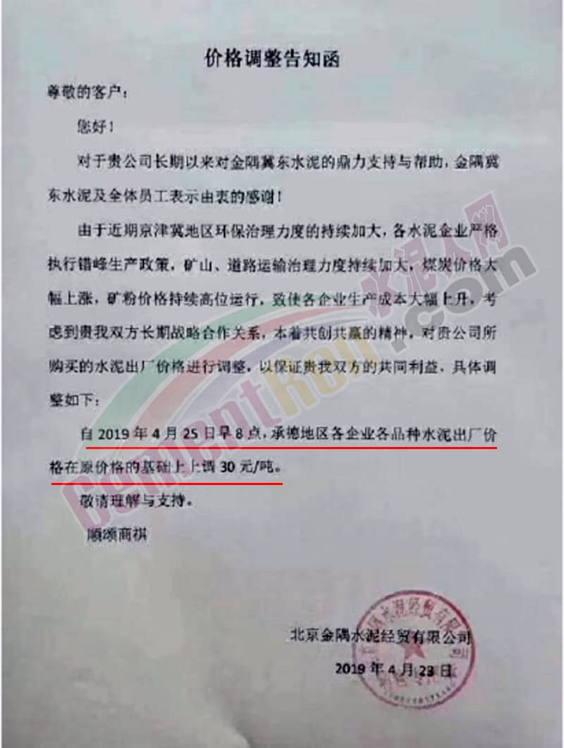 河北承大環(huán)保科技有限公司水泥價(jià)格調(diào)整公函稱,由于京津冀地區(qū)環(huán)保治理力度加大,生產(chǎn)企業(yè)對(duì)政府錯(cuò)峰停產(chǎn)政策嚴(yán)格落實(shí),加之近期能源、電力及生產(chǎn)水泥的礦渣、礦粉等大幅漲價(jià);致使公司水泥生產(chǎn)成本大幅提高,公司根據(jù)水泥生產(chǎn)成本增加和市場(chǎng)情況,經(jīng)研究決定自4月25日早7時(shí)起調(diào)整鉆牌及鈞牌所有水泥產(chǎn)品的銷售價(jià)格,調(diào)整幅度為在原價(jià)基礎(chǔ)上每噸上調(diào)30元。