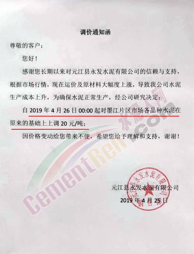 云南元江縣永發(fā)水泥有限公司調(diào)價(jià)通知函稱,根據(jù)市場(chǎng)行情,運(yùn)價(jià)及原材料大幅上漲,導(dǎo)致公司水泥生產(chǎn)成本上升,為確保水泥正常生產(chǎn),經(jīng)公司研究決定自4月26日0點(diǎn)起對(duì)墨江片區(qū)市場(chǎng)各品種水泥在原來(lái)的基礎(chǔ)上上調(diào)20元/噸。