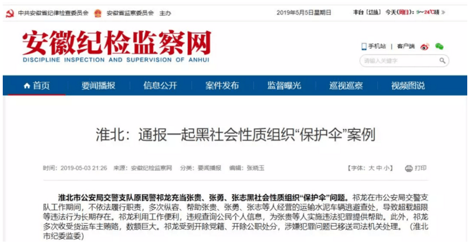 日前,安徽紀檢監(jiān)察網(wǎng)通報一起黑社會性質(zhì)組織“保護傘”案例稱:淮北市公安局交警支隊原民警祁龍充當張貴、張勇、張志黑社會性質(zhì)組織“保護傘”問題。