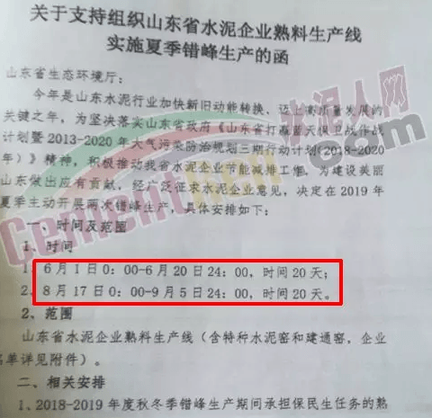 水泥人網(wǎng)消息,山東省2019年水泥企業(yè)熟料生產(chǎn)線(含特種水泥窯和建通窯)夏季錯(cuò)峰時(shí)間已經(jīng)確定,自6月1日起分兩個(gè)階段,共計(jì)停產(chǎn)40天,具體錯(cuò)峰停產(chǎn)時(shí)間如下: