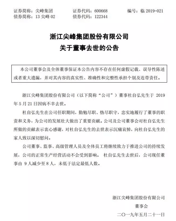 尖峰集團(tuán)股份有限公司5月21日關(guān)于董事去世的公告原文如下: