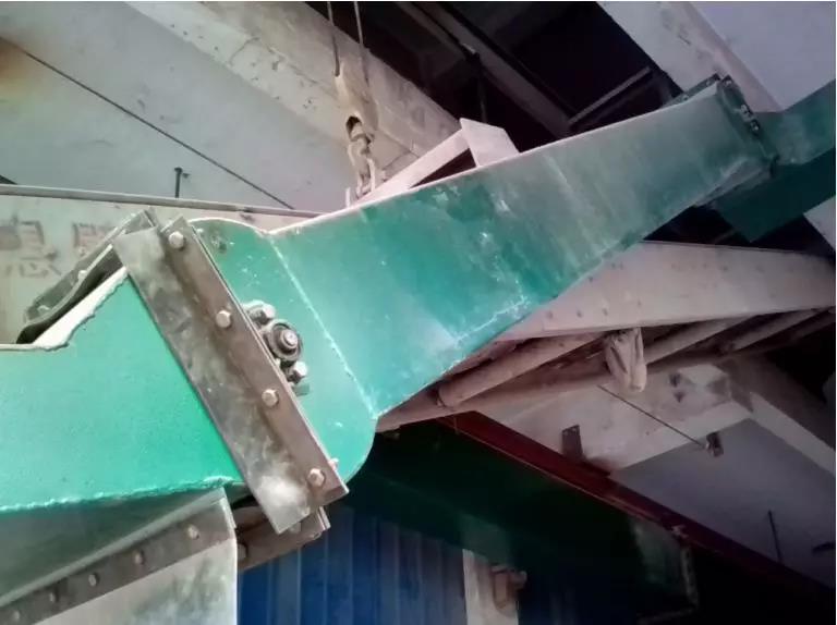 兩半集塵罩上各有一個出風口分別連接抽風主管(兩套),抽風主管一端與集塵罩相連接。另一端與水平伸縮主管(兩套)相連接,連接處為一可旋轉(zhuǎn)活動接頭。保證在裝車過程中集塵罩升降自如。在移動式裝車皮帶機兩側(cè)樓板下面安裝兩套工字鋼軌道和兩套可伸縮的水平抽風主管;每根伸縮節(jié)之間的密封采用橡膠板密封,其內(nèi)安裝滑輪,管外安裝滑輪(以行車電動葫蘆的形式)并放在軌道上,使其隨皮帶機的水平移動而伸縮。
