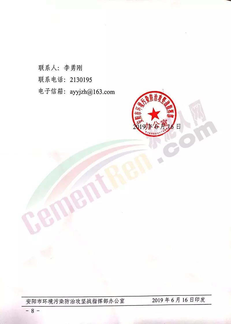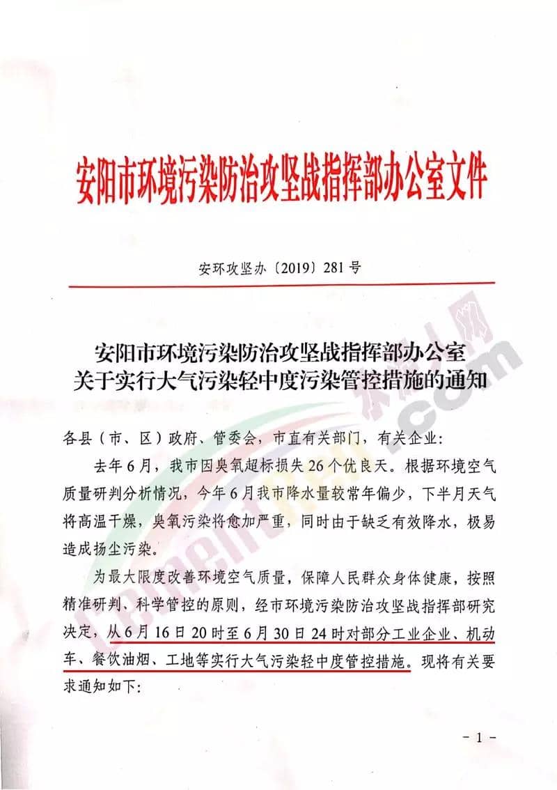 水泥人網(wǎng)通訊員消息:日前,河南省安陽市環(huán)境污染防治攻堅戰(zhàn)指揮部發(fā)布安環(huán)攻堅辦【2019】281號文件《關(guān)于實行大氣污染輕中度污染管控措施的通知》稱去年6月,安陽市因臭氧超標損失26個優(yōu)良天。根據(jù)環(huán)境空氣質(zhì)量研判分析情況 ,今年6月安陽市降水量較常年偏少,下半月天氣將高溫干燥,臭氧污染將愈加嚴重,同時由于缺乏有效降水,極易造成揚塵污染。為最大限度改善環(huán)境空氣質(zhì)量,保障人民群眾身體健康,按照精準研判、科學(xué)管控的原則,經(jīng)安陽市環(huán)境污染防治攻堅戰(zhàn)指揮部研究決定,從6月16日20時至6月30日24時對部分工業(yè)企業(yè)、機動車、餐飲油煙、工地等實行大氣污染輕中度管控措施。