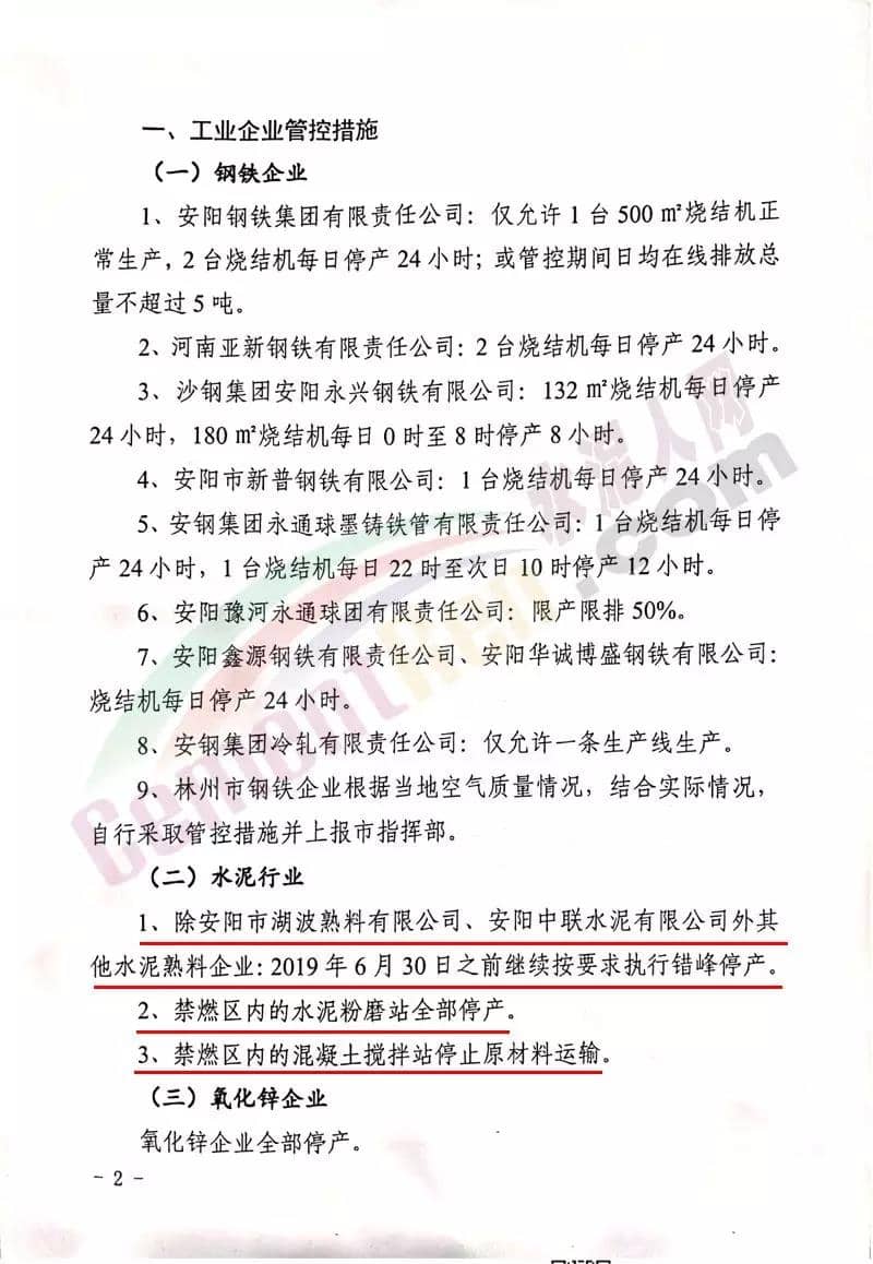 水泥行業(yè)除安陽市湖波熟料有限公司、安陽中聯(lián)水泥有限公司外其他水泥熟料企業(yè):2019年6月30日之前繼續(xù)按要求執(zhí)行錯峰停產(chǎn);禁燃區(qū)內(nèi)的水泥粉磨站全部停產(chǎn);禁燃區(qū)內(nèi)的混凝土攪拌站停止原材料運輸。針對于督導(dǎo)發(fā)現(xiàn)工業(yè)企業(yè)未按要求落實管理措施的,一律停工整改15天。