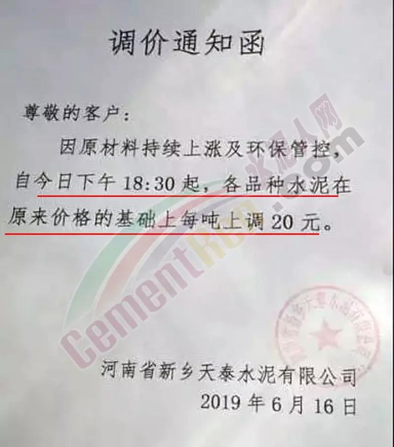6月16日,新鄉(xiāng)天泰水泥有限公司發(fā)布調(diào)價通知,稱因原材料持續(xù)上漲及環(huán)保管控,自當日下午18:30起,各品種水泥在原有價格基礎(chǔ)上每噸上調(diào)20元。
