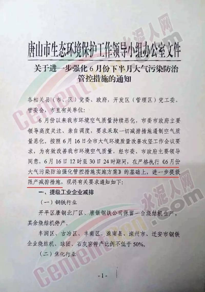 也是在6月16日,河北唐山市生態(tài)環(huán)境保護工作領(lǐng)導(dǎo)小組界定發(fā)布《關(guān)于進一步強化6月份下半月大氣污染防治管控措施的通知》稱:6月份以來唐山市環(huán)境空氣質(zhì)量持續(xù)惡化,市委市政府主要領(lǐng)導(dǎo)高度關(guān)注、親自調(diào)度,要求采取一切減排措施遏制空氣質(zhì)量惡化。按照6月16日全市大氣環(huán)境質(zhì)量改善攻堅工作會議要求,為有效改善全市環(huán)境空氣質(zhì)量,經(jīng)唐山市委、市政府主要領(lǐng)導(dǎo)同意,6月16日12時至30日24時期間,在嚴格執(zhí)行《6月份大氣污染強化管控措施實施方案》的基礎(chǔ)上,進一步提級限產(chǎn)減排措施。