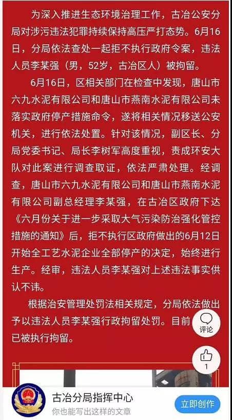 針于古冶區(qū)相關(guān)企業(yè)的管控,唐山市古冶區(qū)公安分局通報了一起拒不執(zhí)行政府令案。通報稱,為深入推進生態(tài)環(huán)境治理工作,古冶公安分局對涉污違法犯罪持續(xù)保持高壓嚴打態(tài)勢。6月16日,分局依法查處一起拒不執(zhí)行政府令案。6月16日,區(qū)相關(guān)部門在檢查中發(fā)現(xiàn),唐山市六九水泥有限公司和唐山市燕南水泥有限公司未落實政府停產(chǎn)措施命令,遂將相關(guān)情況移送公安機關(guān),進行依法處置。針對該情況,副區(qū)長、分局黨委書記、局長李樹軍高度重視,責(zé)成環(huán)安大隊對此案進行調(diào)查取證,依法嚴肅處理。經(jīng)調(diào)查,唐山市六九水泥有限公司和唐山市燕南水泥有限公司副總經(jīng)理李某強,在古冶區(qū)政府下達《六月份關(guān)于進一步采取大氣污染防治強化管控措施的通知》后,拒不執(zhí)行區(qū)政府做出的6月12日開始全工藝水企業(yè)全部停產(chǎn)的決定,始終進行生產(chǎn)。經(jīng)審,違法人員李某強對上述違法事實供認不諱。根據(jù)治安管理處罰法相關(guān)規(guī)定,分局依法做出予以違法人員李某強行政拘留處罰。通報原文如下: