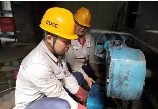 生料維修班副班長(zhǎng)吳軍雙和中控員楊立明正在檢查1號(hào)立磨吐渣提升機(jī)尾部軸承。嚴(yán)謹(jǐn)細(xì)致一直是吳軍雙的作風(fēng),軸承檢查、軸套安裝每一步他都慎之又慎。