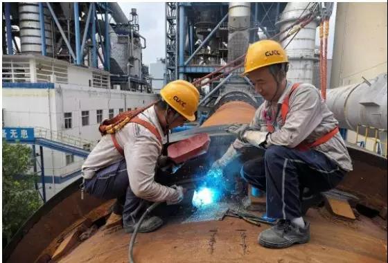 熟料車(chē)間維修工許東和巡檢工張?zhí)禊i正在焊1號(hào)窯輪帶擋鐵,盡管汗水已濕透了工作服,但兩人沒(méi)有絲毫松懈,相互配合默契。