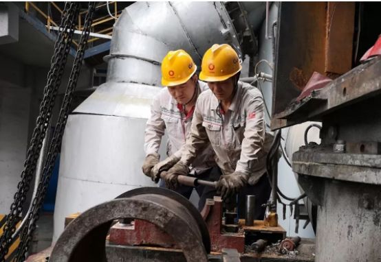 熟料車(chē)間維修班長(zhǎng)張世勇和巡檢工杜明博正在1號(hào)煤磨進(jìn)行設(shè)備檢修,此刻兩人正在對(duì)液壓缸軸承座進(jìn)行定位。