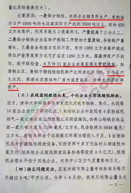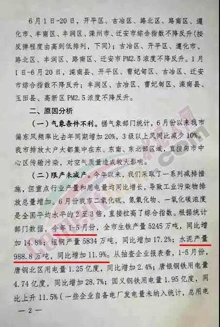 在空氣質量不達標的原因闡述中,限產(chǎn)未減產(chǎn)被視為一個重要方面。其中,部分鋼鐵、水泥企業(yè)超負荷生產(chǎn)。今年1-5月份,唐山市限產(chǎn)卻未減產(chǎn),水泥產(chǎn)量988.8萬噸,同比增加11.9%。主要原因是部分水泥企業(yè)超負荷生產(chǎn),有的設計日產(chǎn)4000噸的水泥窯實際日產(chǎn)達到5500噸以上以及6月份古冶區(qū)六九水泥、燕南水泥窯體和廠房內(nèi)溫度偏高,涉嫌未按要求停限產(chǎn)。