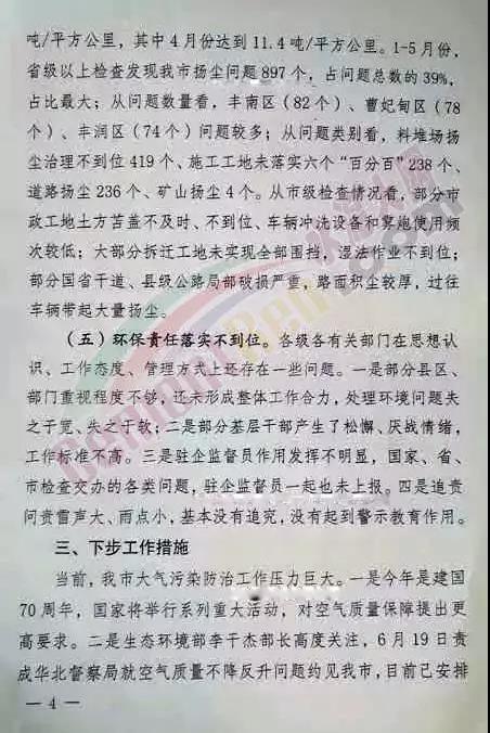 此外,文件指出,唐山市揚塵問題突出,1—5月份,省級以上檢查發(fā)現(xiàn)的揚塵問題有897個,占問題總數(shù)的39%。當前,唐山市大氣污染防治工作壓力巨大。一是今年是建國70周年,國家將舉行系列重大活動,對空氣質量保障提出更高要求。二是生態(tài)環(huán)境部高度重視,6月19日安排專門人員注意摸排重點行業(yè)產(chǎn)量、用電量和去產(chǎn)能情況。