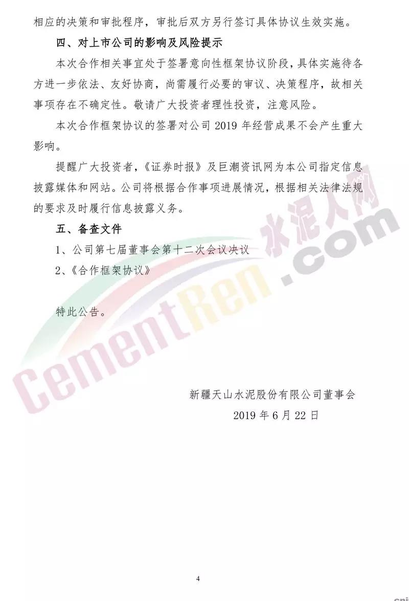 公告稱(chēng):新疆天山水泥股份有限公司于 2019 年 6 月 21 日以通訊表決方式召開(kāi)第七屆董事會(huì)第十二次會(huì)議,審議通過(guò)了《新疆天山水泥股份有限公司關(guān)于全資子公司簽訂合作框架協(xié)議的議案》,同意公司全資子公司宜興天山水泥有限責(zé)任公司(以下簡(jiǎn)稱(chēng)“宜興水泥”)與宜興市金墅水泥有限公司(以下簡(jiǎn)稱(chēng)“金墅水泥”)簽署《合作框架協(xié)議》。