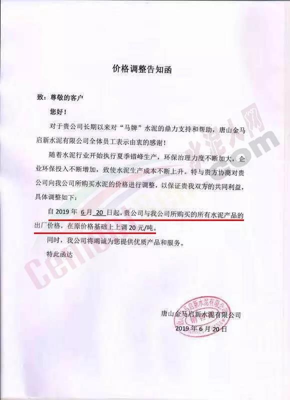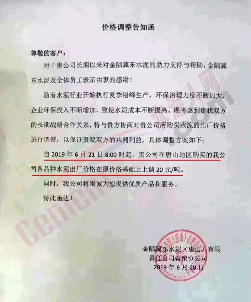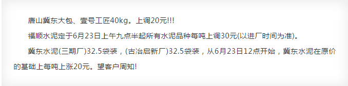 冀東水泥(三期廠)32.5袋裝,(古冶啟新廠)32.5袋裝,從6月23日12點開始,冀東水泥在原價的基礎上每噸上漲20元。望客戶周知!