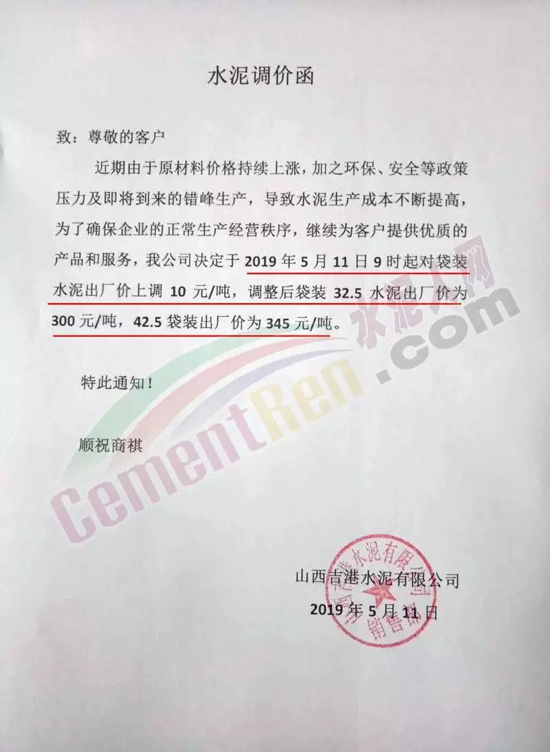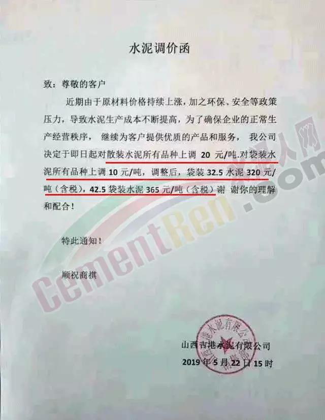 5月22日山西吉港水泥上調水泥價格10-20元/噸